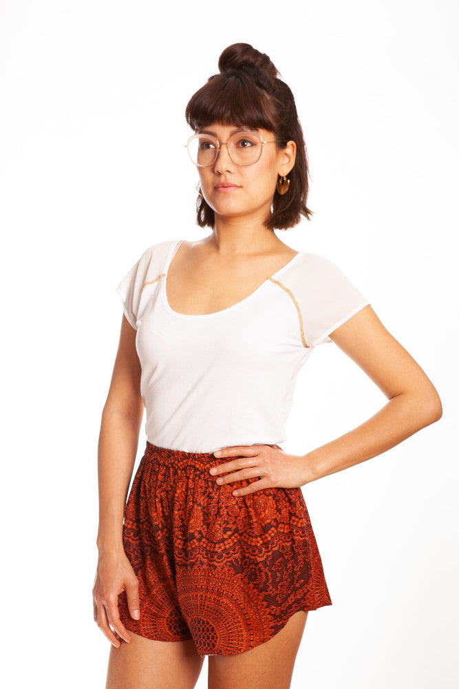 The "Forest Labyrinth" women's shorts can be combined very nicely and you'll want to be with you everywhere in the summer: at the lake, in the city, in the café or simply at home on the balcony or in the garden. Summer can come and we are ready - with the paigh women's shorts. :)