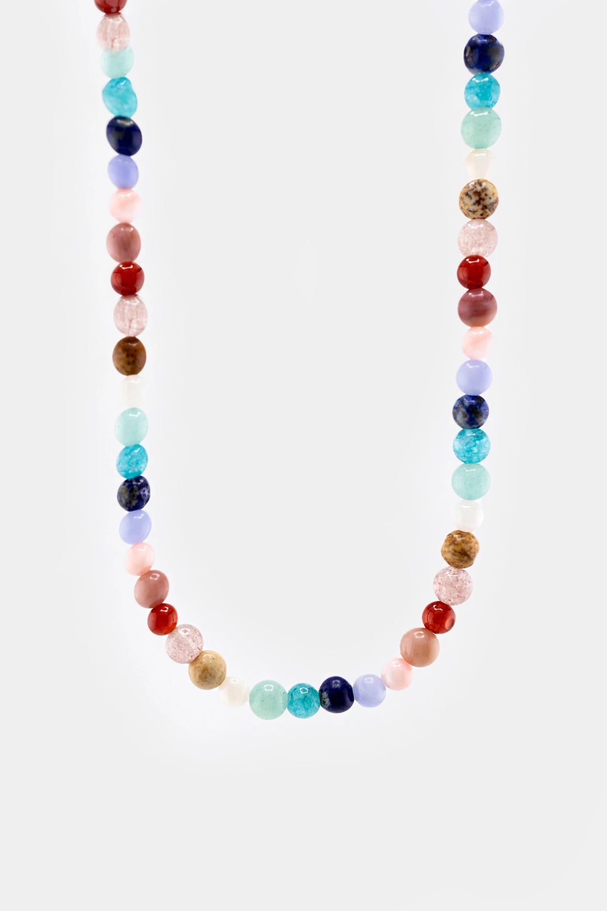 Spüre die Verbindung zur Natur und den Elementen mit der Kette Kraft der Elemente. Die Steine in diesem Produkt – Rosa Koralle, Rhodonit, Karneol-Achat, Erdbeer-Quarz, Bild-Jaspis, Muschel, Aqua-Amazonit, Dunkelblauer Chalcedon, Lapislazuli und Blauer Spitzenachat – stehen für die harmonische Energie von Erde, Wasser, Feuer und Luft. Rhodonit und Bild-Jaspis fördern Erdung und Stabilität, während Karneol-Achat und Erdbeer-Quarz mit ihrer feurigen Energie Kreativität und Selbstbewusstsein stärken. Die kühlen Blau-Töne der Chalcedon- und Lapislazuli-Steine bringen Klarheit und Ruhe in den Geist.