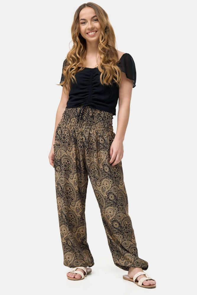 As calças harem paigh são a companhia perfeita para todas as situações. Seja no ioga, na praia, no parque ou em casa, no sofá. O tecido de viscose macio e leve torna as calças incrivelmente confortáveis e quase impercetíveis em contacto com a pele. O cós largo e altamente elástico garante que as calças se ajustam às ancas sem pressão, mas com bastante apoio, adaptando-se ao seu corpo. Cores e padrões vibrantes dão o toque final ao conforto, tornando o seu mundo um pouco mais colorido a cada dia.