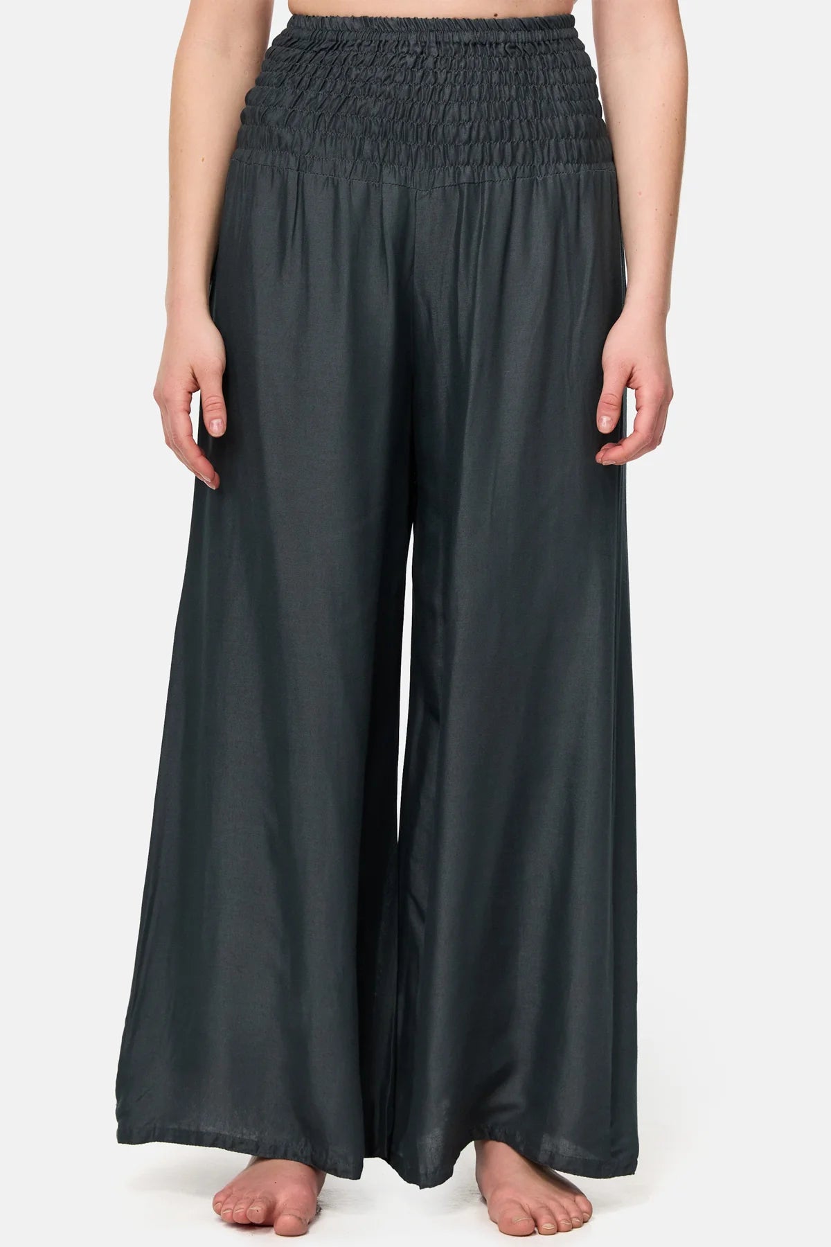As calças harém Palazzo 100% viscose são feitas à mão na nossa fábrica certificada pela WFTO na Tailândia, apoiando empresas locais com salários justos.