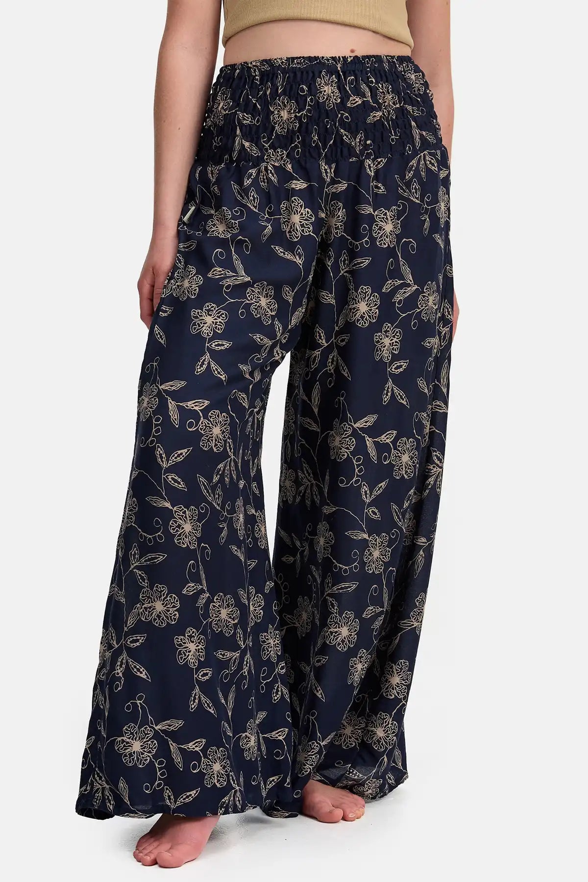 As calças harém Palazzo 100% viscose são feitas à mão na nossa fábrica certificada pela WFTO na Tailândia, apoiando empresas locais com salários justos.