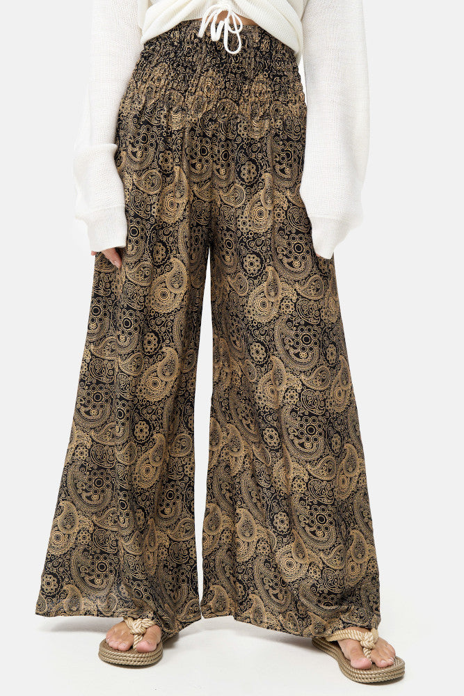 As calças harém Palazzo 100% viscose são feitas à mão na nossa fábrica certificada pela WFTO na Tailândia, apoiando empresas locais com salários justos.