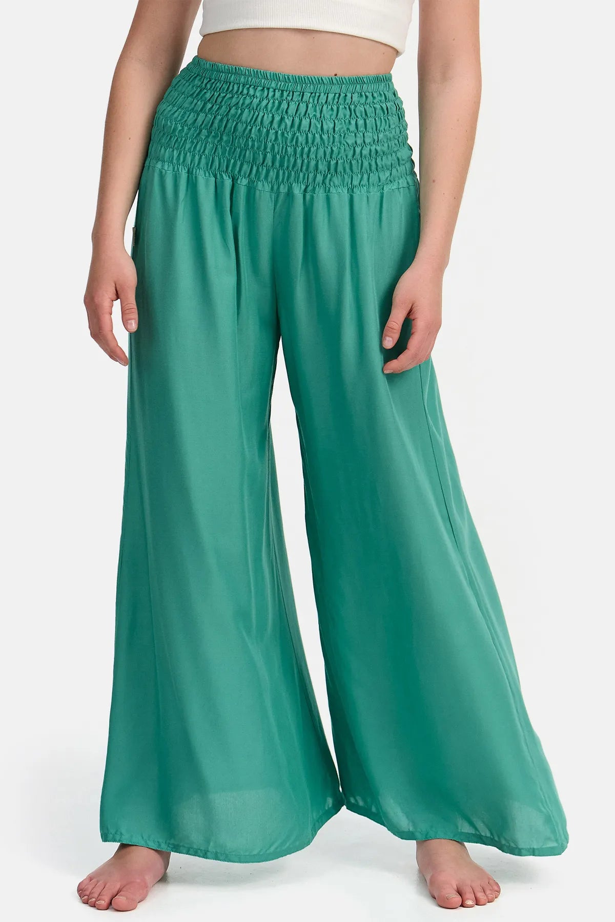 As calças harém Palazzo 100% viscose são feitas à mão na nossa fábrica certificada pela WFTO na Tailândia, apoiando empresas locais com salários justos.