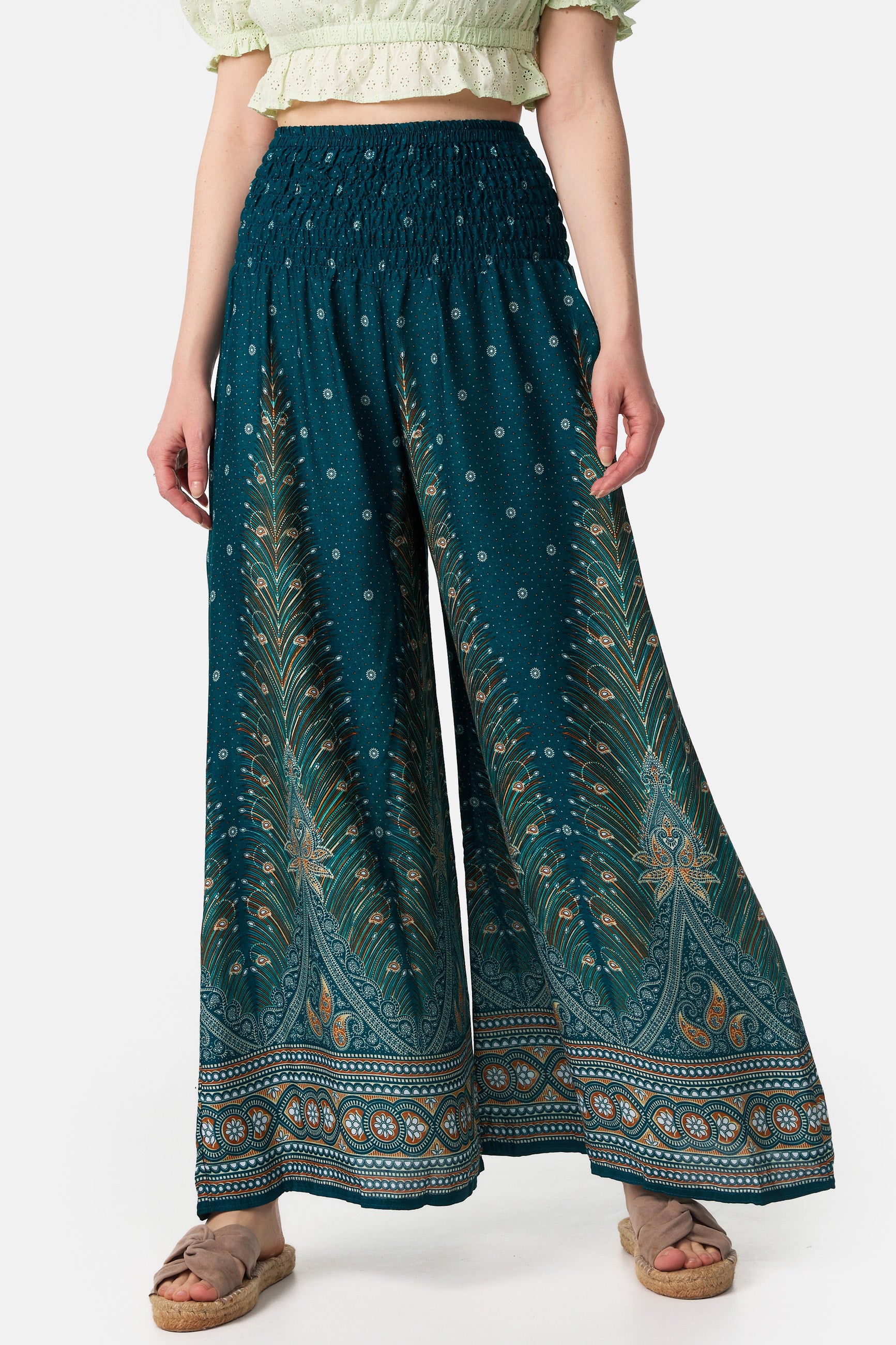 As calças harém Palazzo 100% viscose são feitas à mão na nossa fábrica certificada pela WFTO na Tailândia, apoiando empresas locais com salários justos.