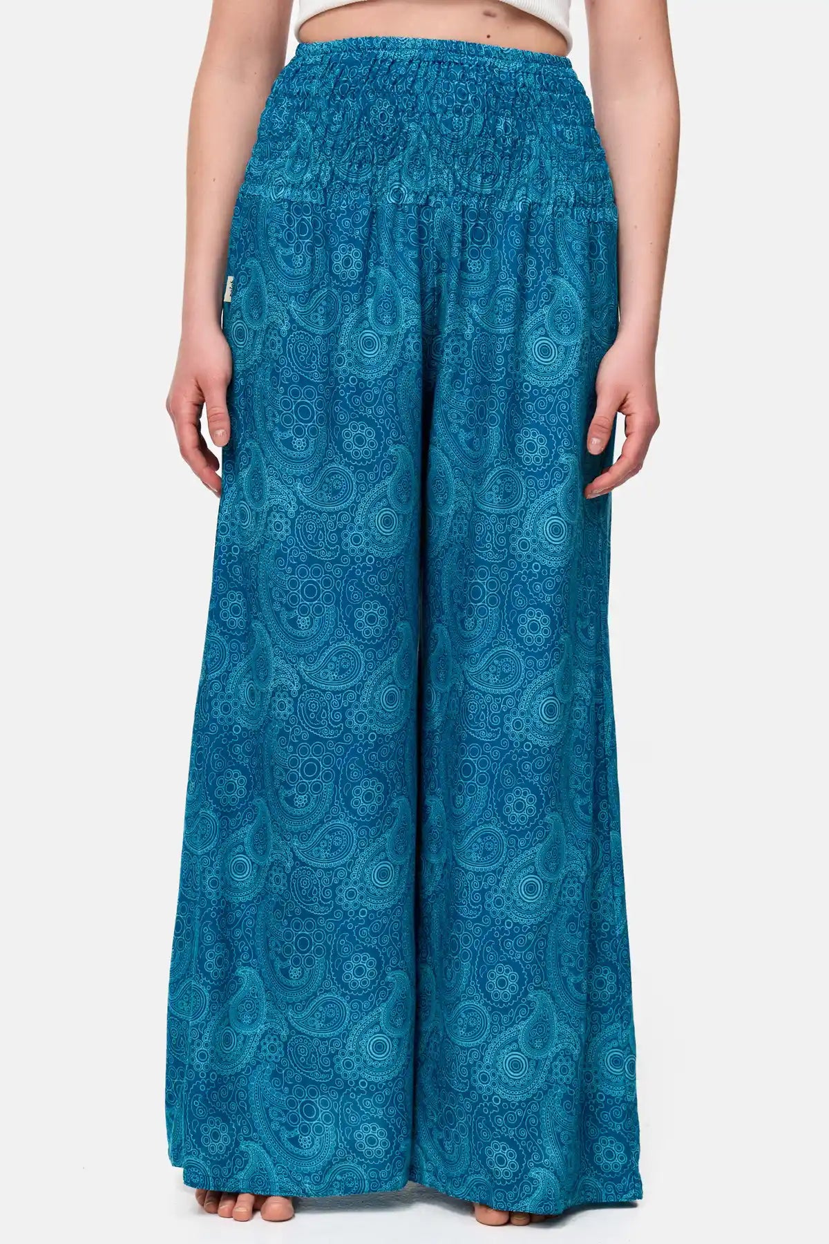 As calças harém Palazzo 100% viscose são feitas à mão na nossa fábrica certificada pela WFTO na Tailândia, apoiando empresas locais com salários justos.