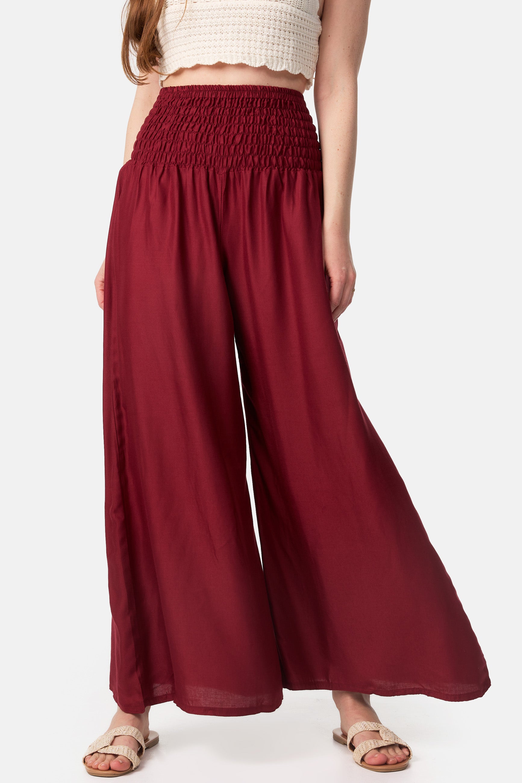 As calças harém Palazzo 100% viscose são feitas à mão na nossa fábrica certificada pela WFTO na Tailândia, apoiando empresas locais com salários justos.