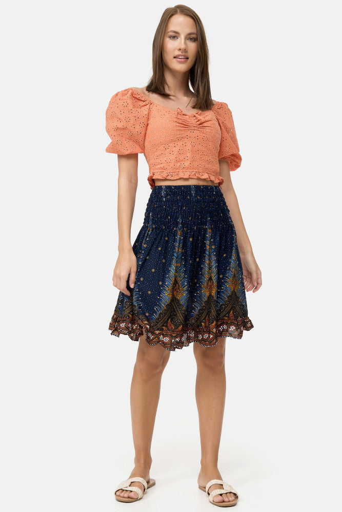 Para estarmos prontas para o verão, temos uma nova saia na família que complementa na perfeição a nossa coleção de verão. Esta saia curta tem um cós largo e muito elástico, permitindo que seja usada tanto à altura da anca como um pouco mais abaixo. A saia é rematada com "asas" subtis que acrescentam um toque de largura e soltura ao corte. Sejam dias quentes na cidade ou dias relaxantes de férias, a saia leve Paigh combina sempre com o seu bom humor e alegra o seu dia.